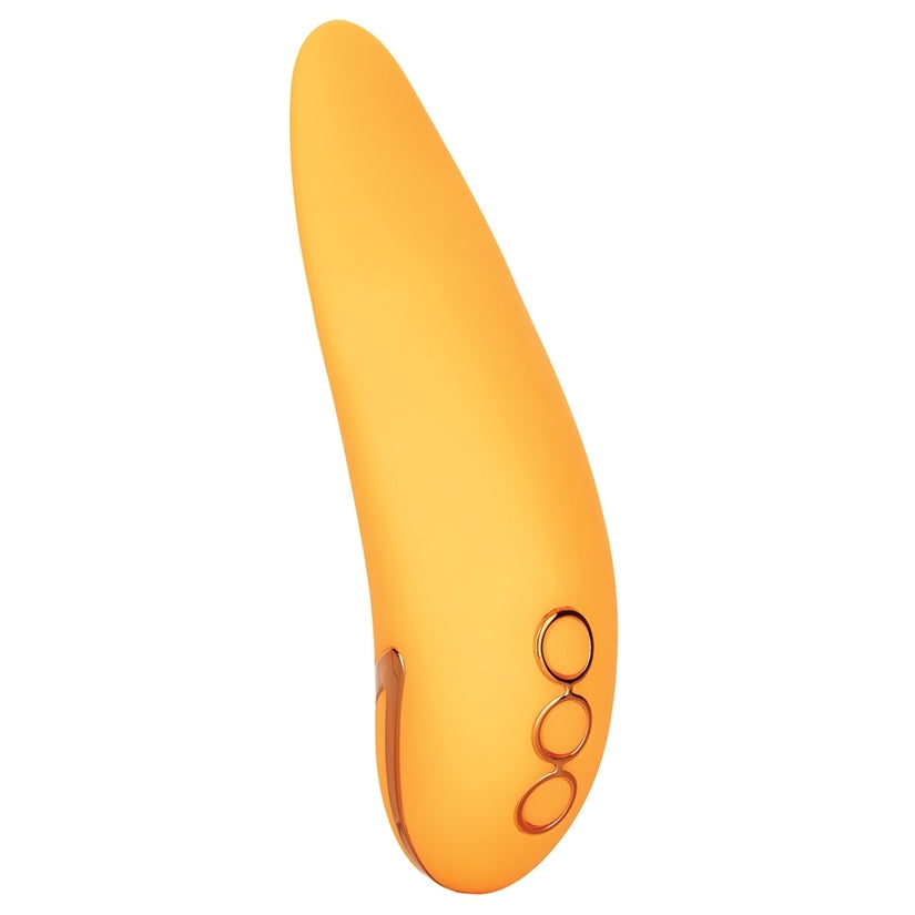 curved vibrator is covered in a silky silicone and has a flickering tip for