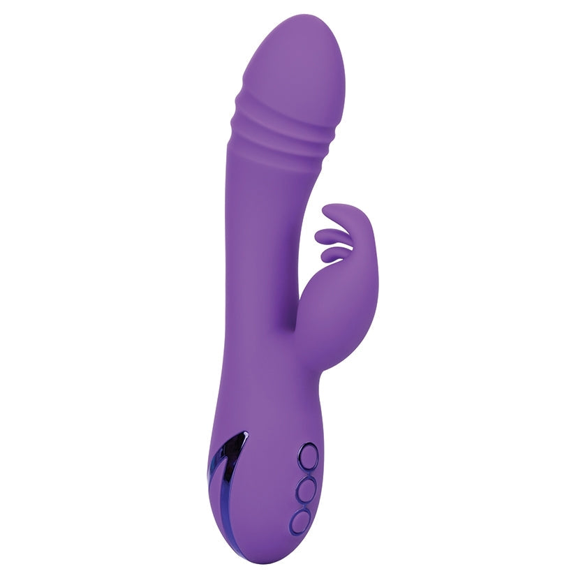 Set free the motion of the ocean with the California Dreaming West Coast Wave Rider. This beautiful, ocean-colored adult toy is made of body-safe silicone and is-- you guessed it: Fully waterproof, for the convenience of an anywhere- use device. This device has a powerful rotating "G" massager built into the head of the device, ensuring it knows exactly where the good waves are. The triple-fluttering teaser gives this outstanding vibrator the one-two ride that you've been missing. With three speeds of rotating "G" action within the shaft and 10 functions of independent vibration, pulsation, and escalation built into the attached stimulator, you will always feel your own personal