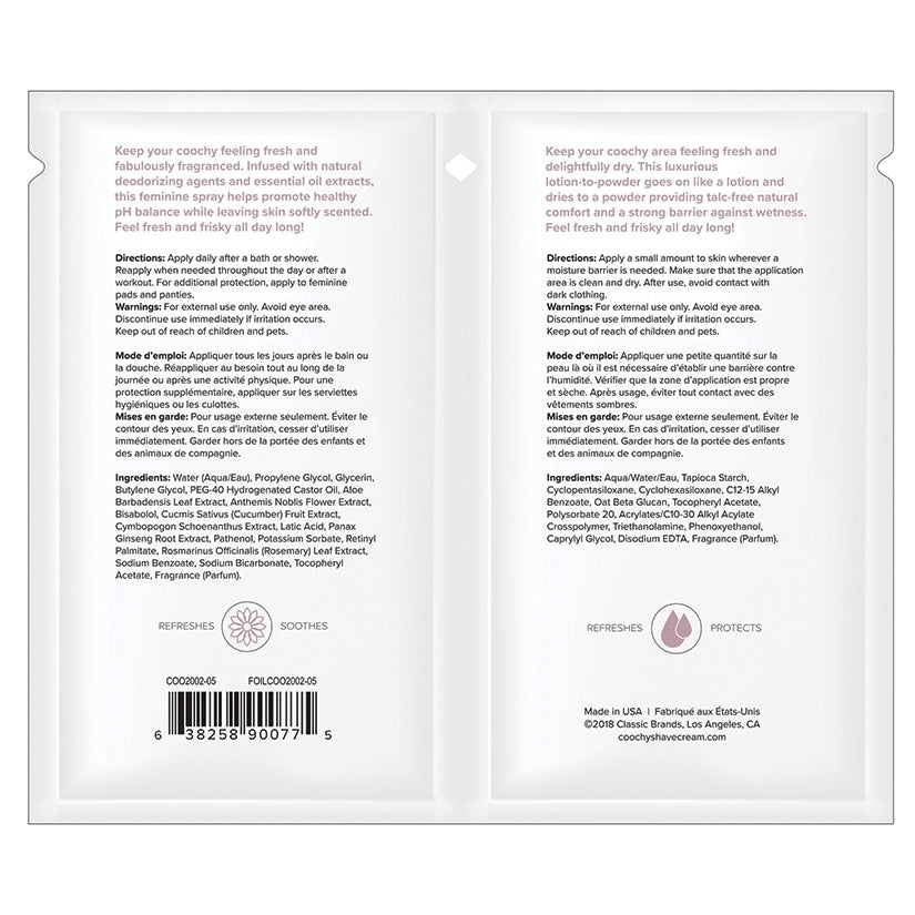 A convenient way to try or travel with Coochy Intimate Protection Lotion and Feminine Spray. Treat your skin to a protective and refreshing treatment with this dynamic duo. Lotion will keep you fresh and dry while feminine spray will keep you smelling fresh.