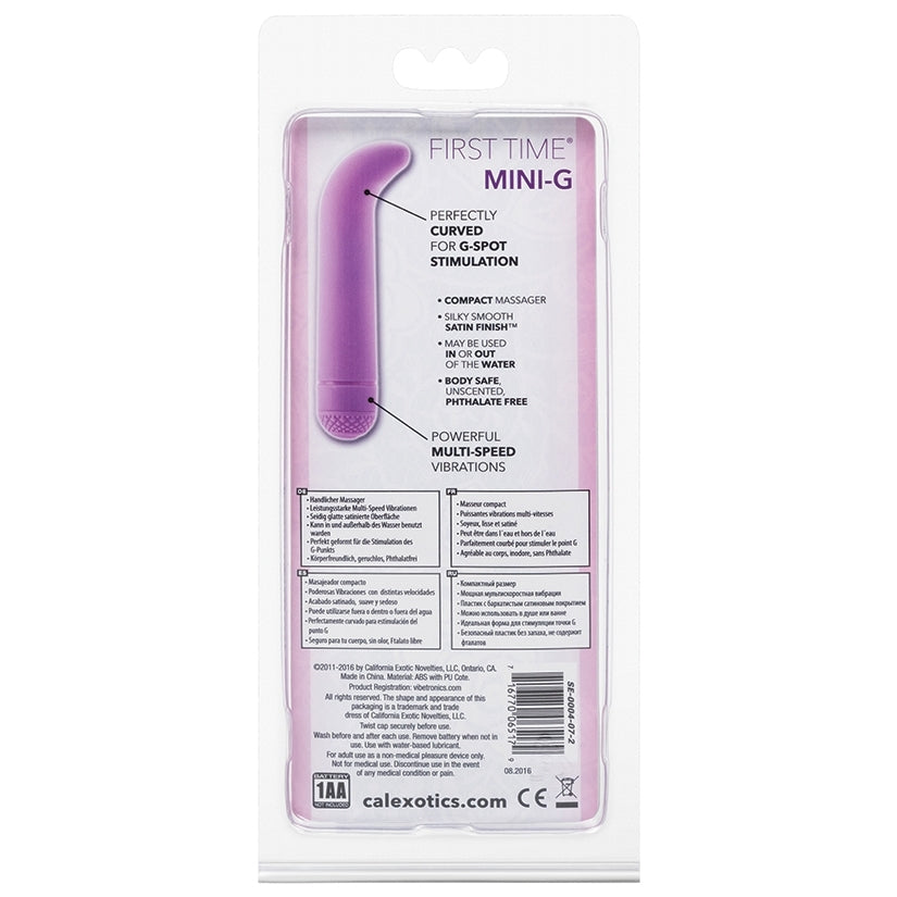 Tantalize your curves with the exotic First Time Mini-G. This versatile and curvaceous mini vibe has a velvety smooth finish, and delicate curved tip. The ultra feminine multi-speed stimulator can be used for intimate, sensual exploration, or for massaging the entire body. The compact and lightweight pastel stimulator features a satin finish, solid shaft and an angled, curved tip that is designed to provide pleasurable G-spot arousal and climax. To control and change the intensity of the multi-speed vibration function simply twist the end cap. Use the discreet waterproof vibe to stimulate and massage