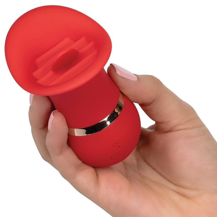The tantalize French Kiss Charmer is a travel-ready flickering tongue teaser made for sensual stimulation. The compact massager fits just between your fingers to deliver powerful flickering pleasure with 12 sensual functions of fluttering vibration through the full encaser and tongue-like tip. The full contact scoop and fluttering tongue teaser has been crafted to perfectly contour to your most intimate pleasure points. The soft supple silicone and sensually contoured body let you deliver pinpoint pure pleasure form almost angle.