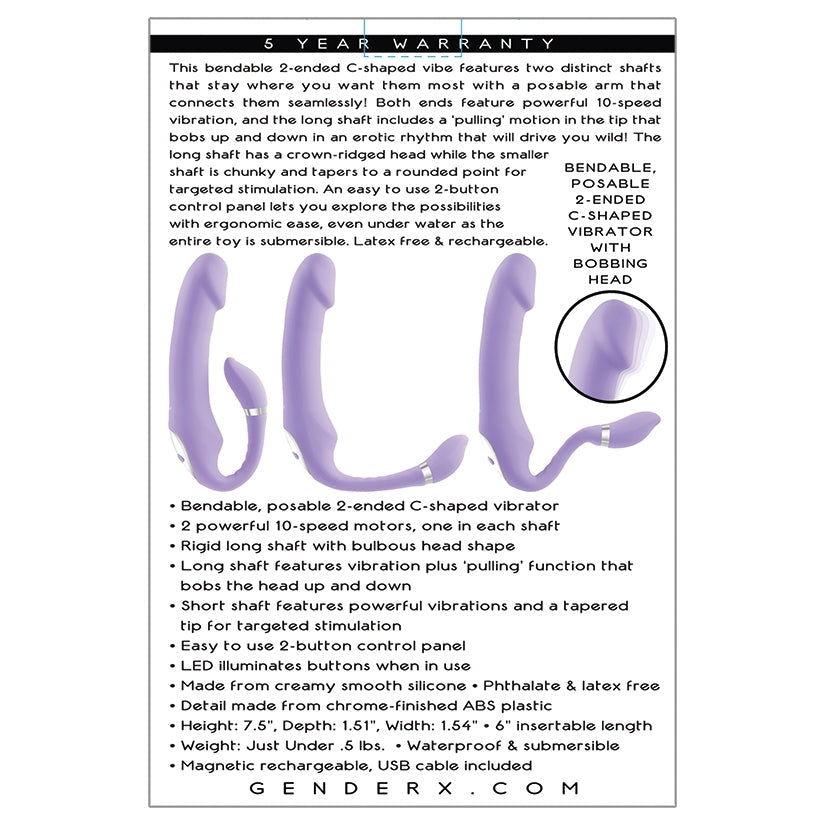 This bendable 2-ended C-shaped vibe features two distinct shafts that stay