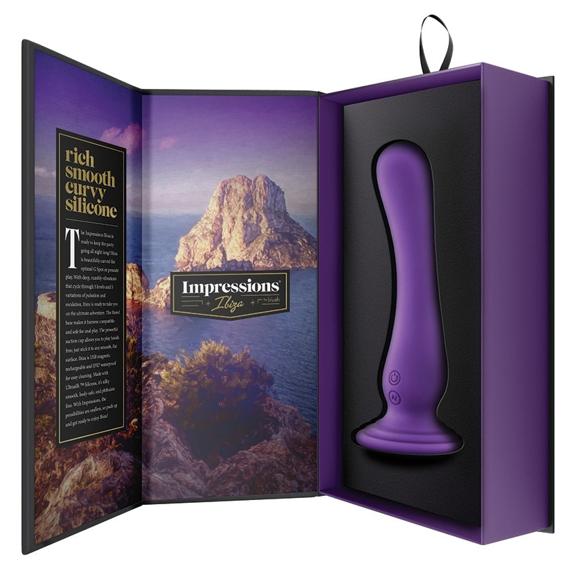 The Impressions Ibiza is ready to keep the party going all night long! Ibiza is beautifully curved for optimal G Spot or prostate play. With deep, rumbly vibrations that cycle through 5 levels and 5 variations of pulsation and escalation using the powerful Rumble tech motor, Ibiza is ready to take you on the ultimate adventure. The flared base makes it harness compatible and safe for anal play. The powerful suction cup allows you to play hands free; just stick it to any smooth, flat surface. Ibiza has Magna Charge USB magnetic recharging to ensure it remains waterproof for the lifetime of the product and IPX7 waterproof for easy cleaning.