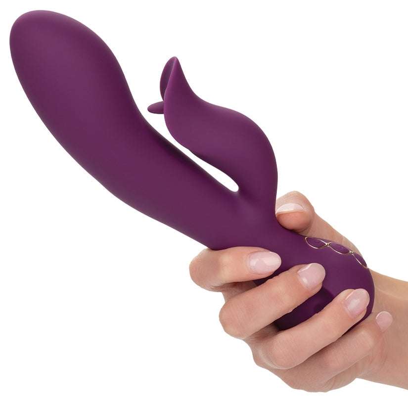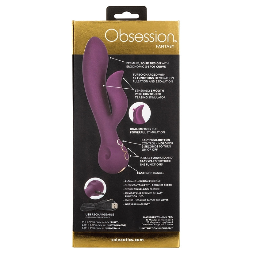 Decadent pleasure is at your fingertips with the indulgent Obsession Fantasy. The turbo-charged dual vibrator is sure to satisfy with the intimately curved shaft, flickering teaser, and 10 powerful functions of vibration. The high- powered massager is created with a sensually curved design with flickering teaser and smooth shaft. The high-powered massager is created with a body contouring design with naturally curved stimulator and shaft. Embrace knee-shaking stimulation with the powerful dual motors. Scroll forward and backward through the variety of orgasmic options with the easy two button controls. The massager is made from a hygienically superior silicone and finished with indulgent designer decor. This body safe material is unscented and phthalate free to keep your most sensitive spots happy and healthy. Whether you're taking a dip with a lover or indulging in a steamy solo session, look forward to up to 90 minutes of waterproof vibration. Recharge pleasure and get back to playtime in only 2.5 hours with the provided USB cable.