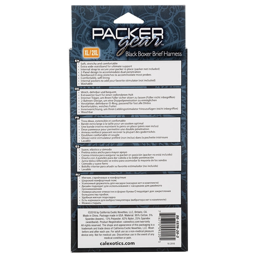 The Packer Gear Black Boxer Brief Harness is an ultra-comfortable, easy wear harness designed with powerful performance and comfort in mind. This classic harness has a supportive extra-wide waistband, soft stretchy material and internal probe straps for the ultimate support. Enjoy double penetration pleasure with the accommodating 2-panel design and unique bullet stimulation pocket. The durable, reinforced O-ring stretches to accommodate your favorite packer, vibrator or dildo. Beginners and expert users alike will love frustration-free pleasure with this easy-to-wear harness. Simply secure your