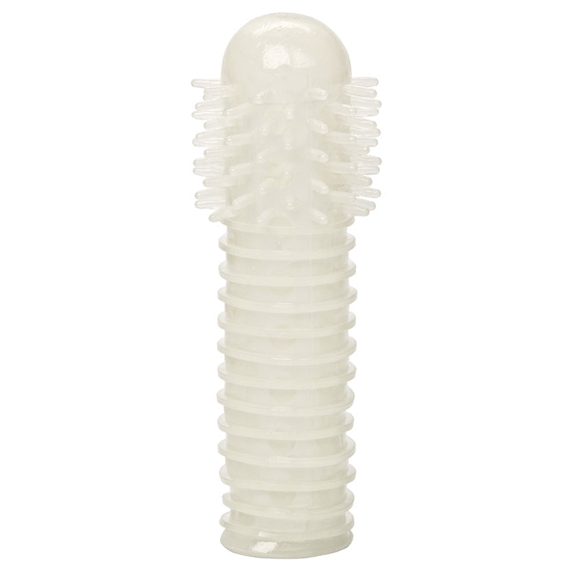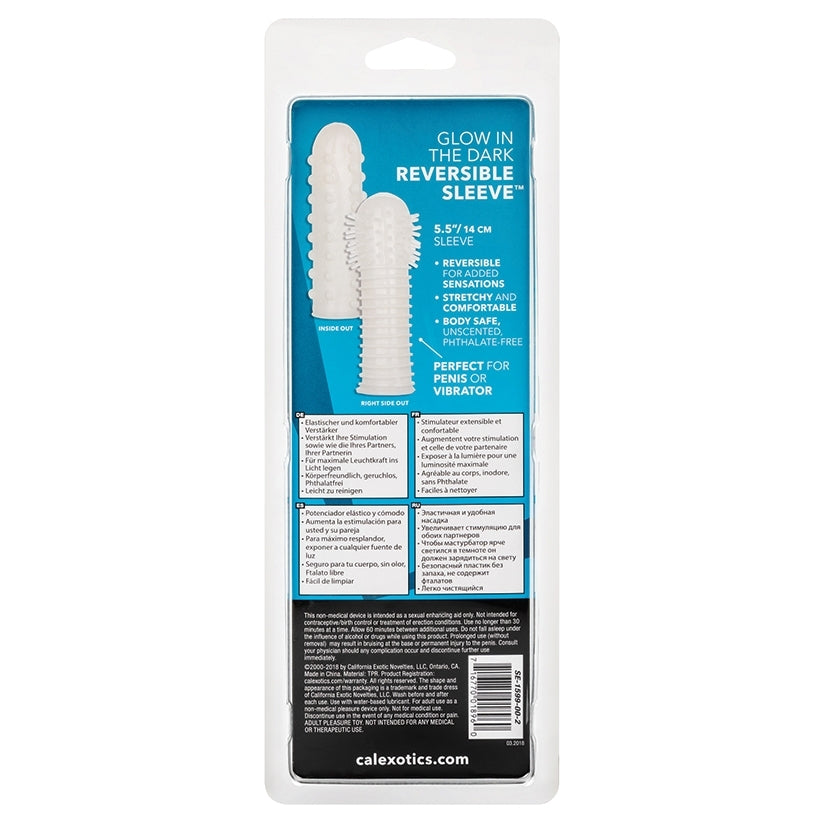 a close comfort fit. The reusable pleasure tool accommodates the penis and delivers intense sensations and tingles for both partners. The nodules and nubs tease and excite, and increase stimulation pleasure. To use, insert the penis into the sleeve to experience ultimate orgasmic delight. If using the double-sided sleeve with a vibe, slip it over the shaft and let the fun begin. For intense climax every time always use the Glow-In-The-Dark Reversible Sleeve with water-based lube. The unique accessories glow-in-the-dark finish