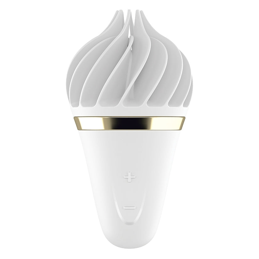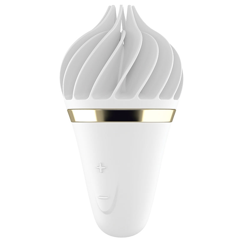 The Satisfyer Sweet Treat is probably the sweetest of all clit vibrators - because this ice cream cone has it all, It brings your clitoris to super sweet climaxes like never before with the rotating fins. Pleasantly soft, skin-friendly silicone nestles around your pleasure pearl and takes care of your sexual wellness with powerful devotion, no matter where you are. The seductive cone fits comfortably in your hand - so you can easily control the 10 exciting vibration levels, consisting of 4 rotation rhythms and 3 right and left speeds each.