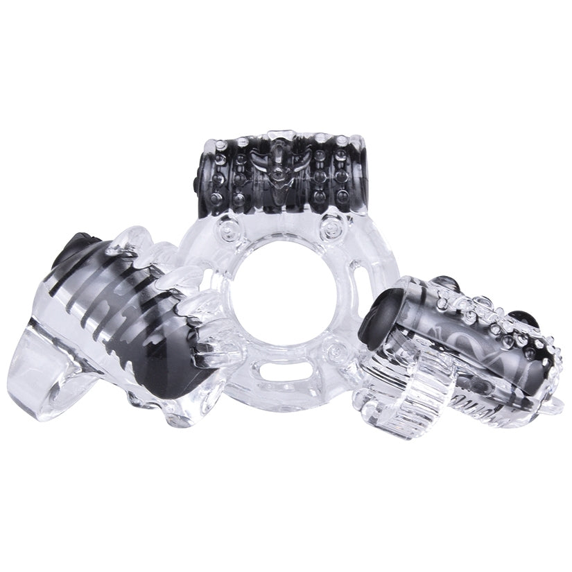 vibration in all its forms. This convenient collection offers him a 3-point upgrade with three powerful mini vibes designed to stimulate in very different ways. The mini tongue vibe stretches to fit around his tongue to add a vibrating boost to any cunnilingus session. The mini fingertip vibe sits at the end of any finger and makes it easy to tease, tickle and massage every erogenous zone especially the clitoris to help orgasms come easier during intercourse! And the vibrating ring makes his whole package vibrate thanks to a super-stretchy ring that fits comfortably around his penis and testicles. When worn with the motor sitting on top, he can stimulate her clitoris with every thrust and intensity her pleasure in some of her favorite sex positions.