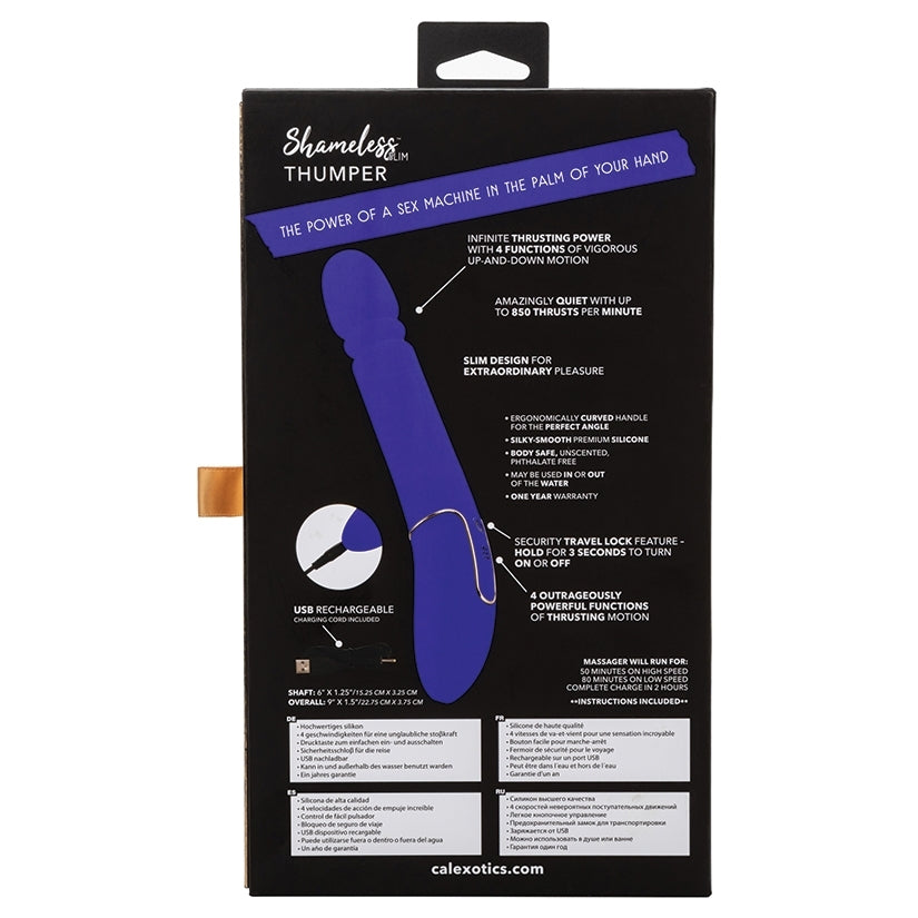 The power of a sex machine in the palm of your hand now that's Shameless! This luxury massager is unapologetically powerful with up to 850 thrusts per minute. With a sexy, slim shaft; this sensational vibe has it all. There is no shame in this game! Experience all the thrusting pleasure you crave with this Thumper. It features 4 functions of vigorous up-and-down motion and is made with body-safe silicone that feels amazing on the skin.