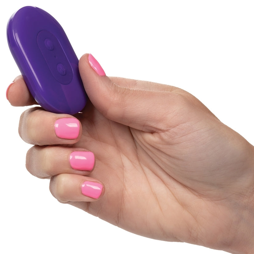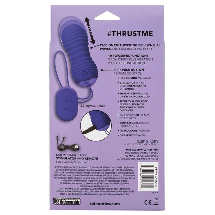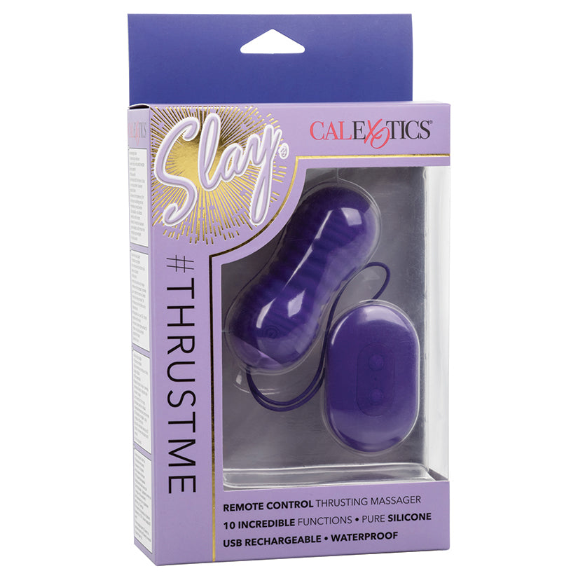 Enjoy your cute but functional, peanut-shaped device called the Slay ThrustMe. This thrusting, rotating, and fully-textured adult toy is fun for solo use, but for the truly adventurous, it also comes with a remote for a partner to play, too! The 10 meter range (32+ feet) remote distance gives you plenty of room for the most innovative of play. Let your imagination run wild!
